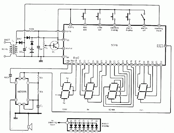 Here is a circuit for electronic enthusiasts who can make a digital clock without using any expensive . Pin #1 is clock input, when we apply clock signal, the ic increments the count. Marshall brain here's a circuit diagram for the power supply and time base. Lm8560 is digital clock circuit ic that electronic amateurs are most interested. As we saw in the article on electronic gates, the power supply is the most difficult part!